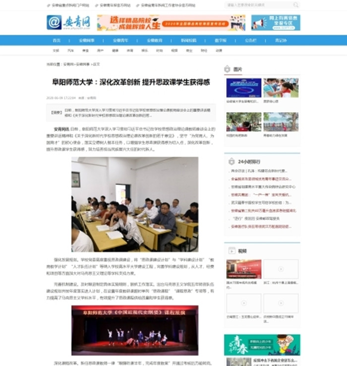 6月9日,安青网报道:阜阳师范大学:深化改革创新 提升思政课学生获得感。文章地址:
