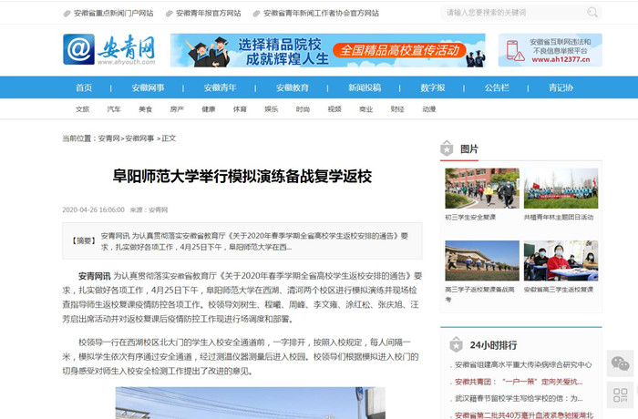 4月26日,安青网报道:阜阳师范大学举行模拟演练备战复学返校。文章地址: