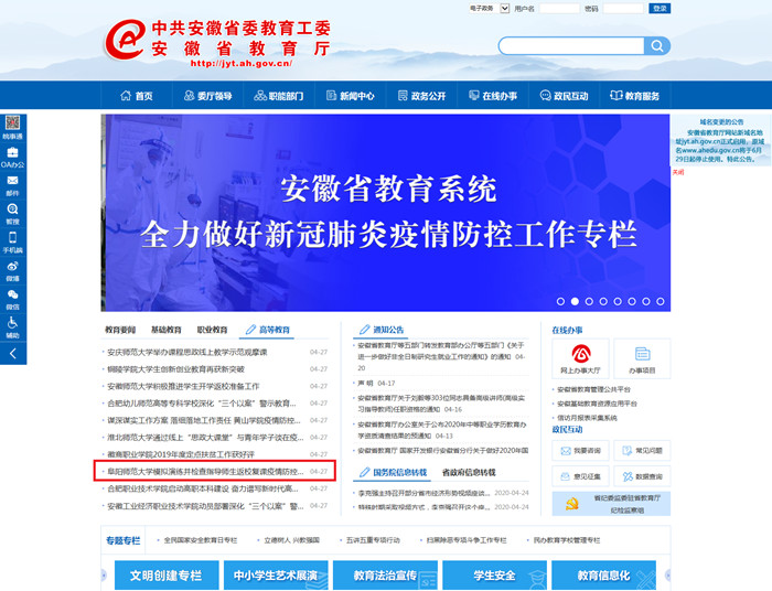 4月27日,安徽教育网首页报道:阜阳师范大学模拟演练并检查指导师生返校复课疫情防控各项工作。文章地址: