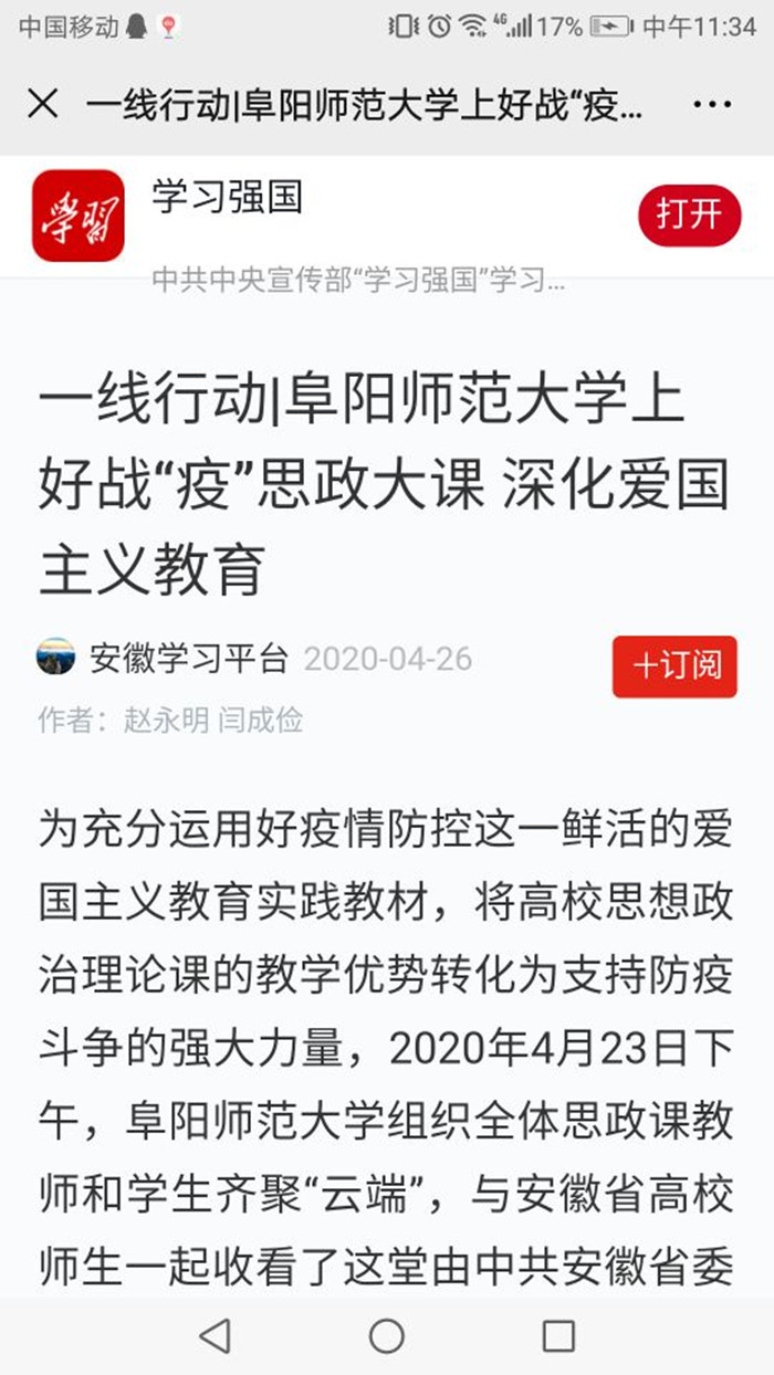 4月26日,“学习强国”学习平台报道:一线行动|阜阳师范大学上好战“疫”思政大课 深化爱国主义教育。文章地址:https://article.xuexi.cn/articles/index.html?art_id=3430964398626118307&item_id=3430964398626118307&study_style_id=feeds_default&pid=&ptype=-1&source