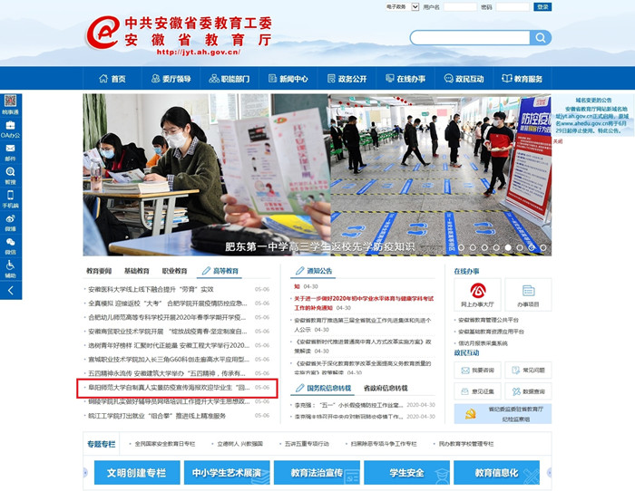 安徽教育网首页报道:阜阳师范大学自制真人实景防疫宣传海报欢迎毕业生“回家”