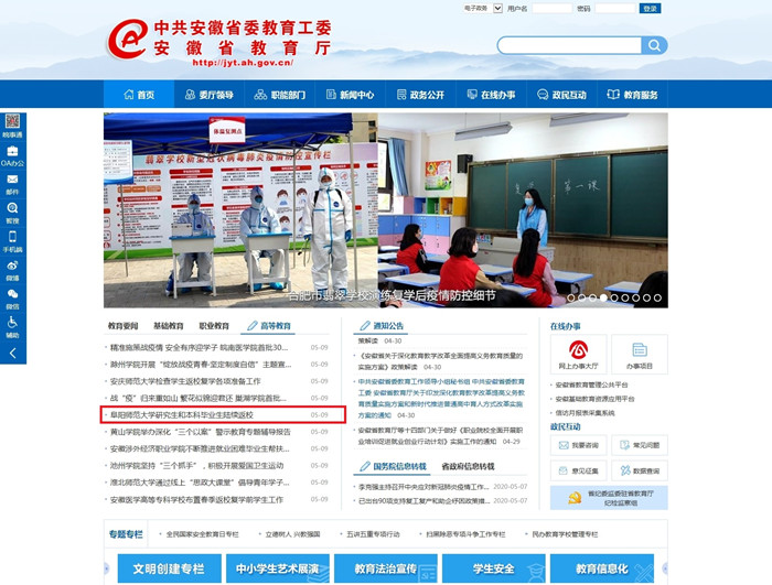 安徽教育网首页报道:阜阳师范大学研究生和本科毕业生陆续返校