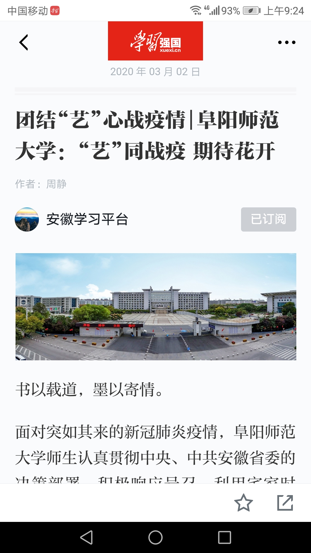 3月2日,“学习强国”学习平台报道:团结“艺”心战疫情|阜阳师范大学:“艺”同战疫 期待花开。文章地址:https://article.xuexi.cn/articles/index.html?part_id=15879769656321305797&art_id=15879769656321305797&item_id=15879769656321305797&study_style_id=feed