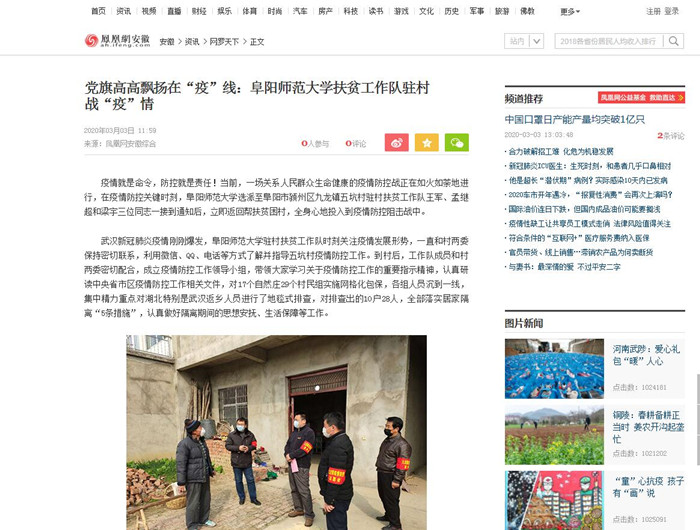 3月3日,凤凰网报道 党旗高高飘扬在“疫”线:阜阳师范大学扶贫工作队驻村战“疫”情。文章地址: