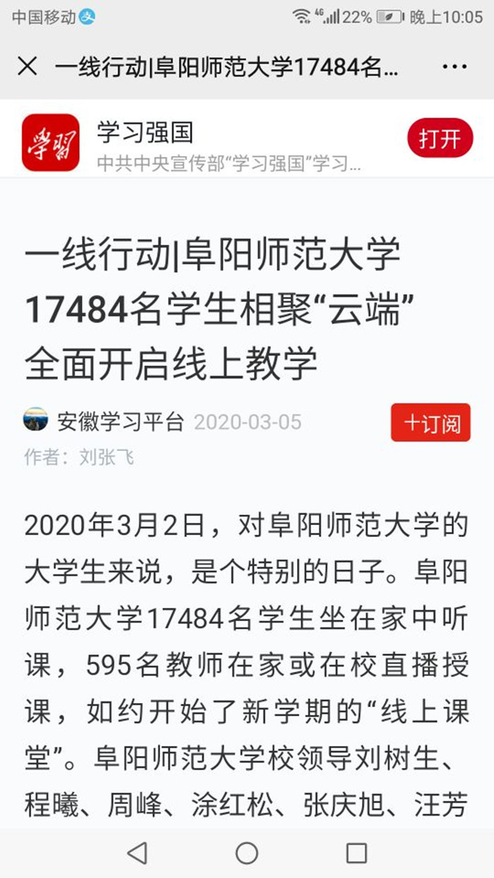 3月5日,“学习强国”学习平台报道:一线行动|阜阳师范大学17484名学生相聚“云端” 全面开启线上教学 。文章地址:https://article.xuexi.cn/articles/index.html?part_id=17508653466763812602&art_id=17508653466763812602&item_id=17508653466763812602&study_style_id=feed