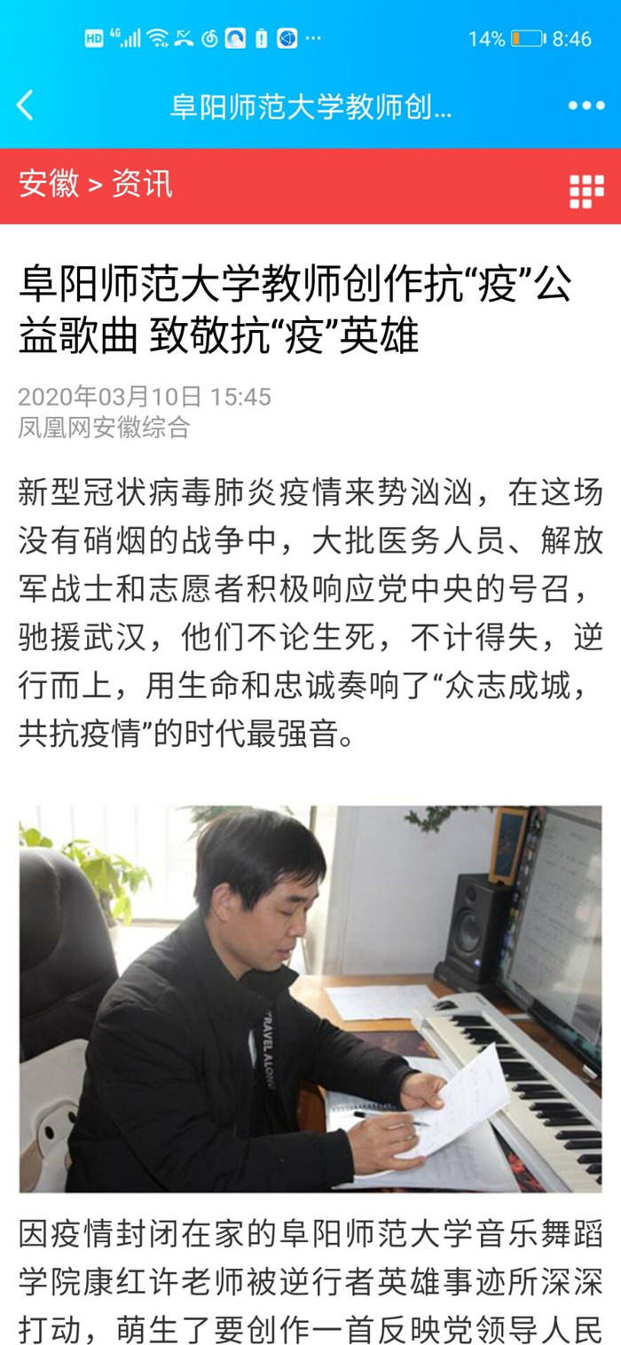 【疫情防控】凤凰网报道:阜阳师范大学教师创作抗“疫”公益歌曲 致敬抗“疫”英雄