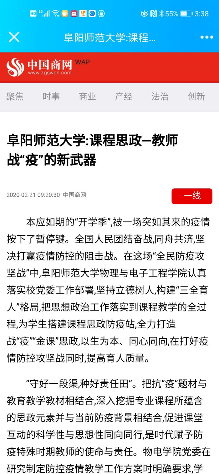 2月21日,中国商网报道:阜阳师范大学:课程思政—教师战“疫”的新武器。文章地址:http://st.zgswcn.com/article/202002/202002210920301040.html