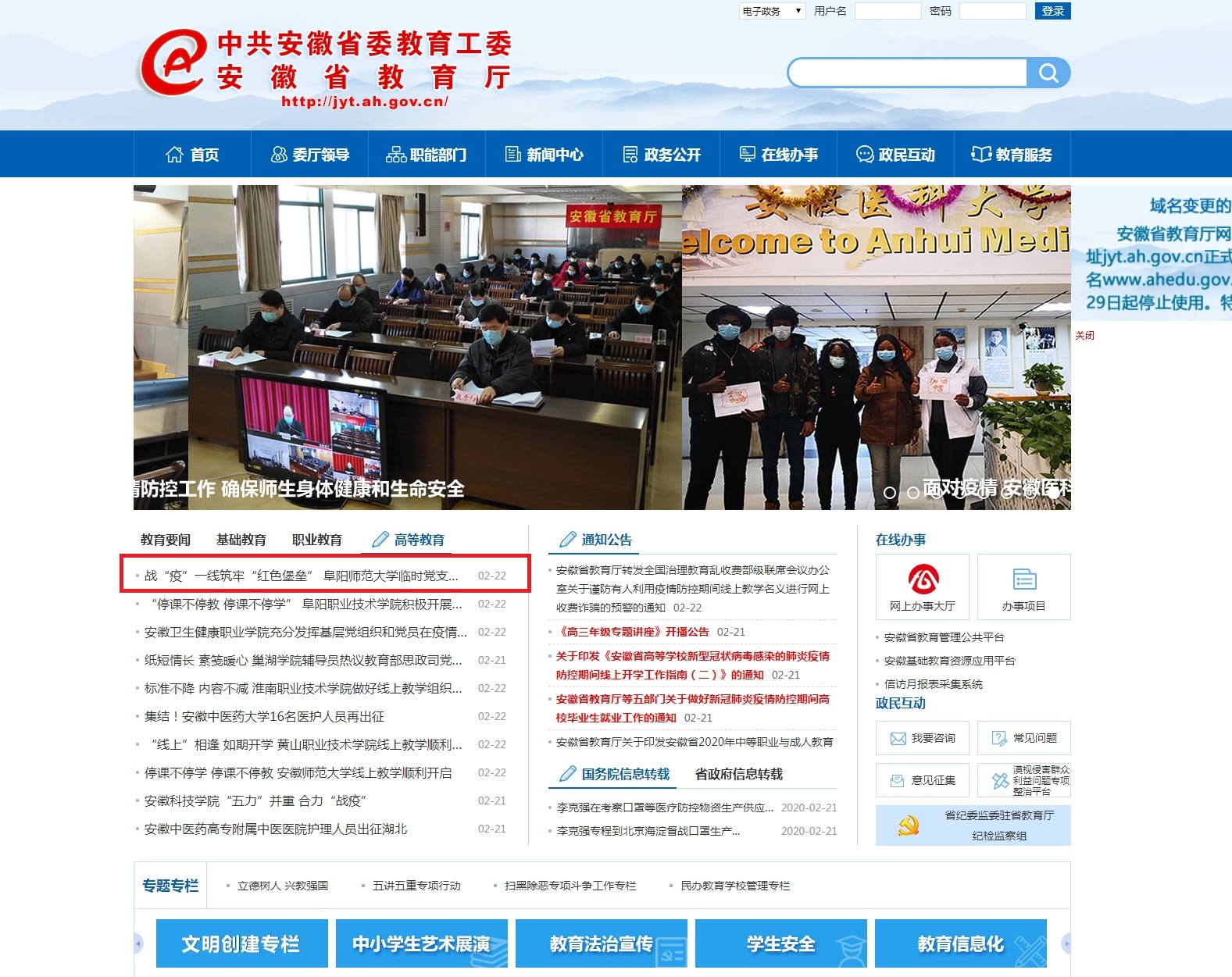 【疫情防控】安徽教育网首页报道:战“疫”一线筑牢“红色堡垒” 阳师范大学临时党支部吹响最强 “集结号”