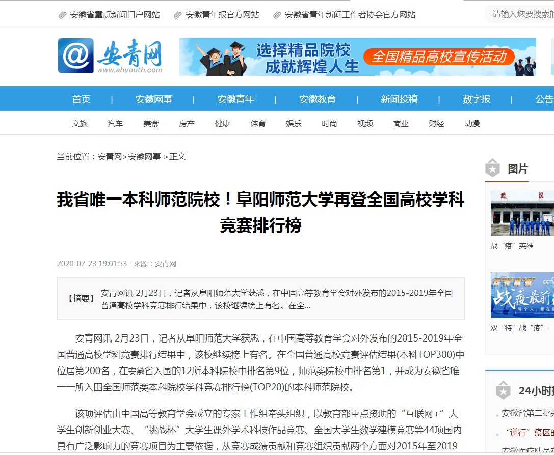 2月23日,安青网报道:我省唯一本科师范院校!阜阳师范大学再登全国高校学科竞赛排行榜。文章地址: