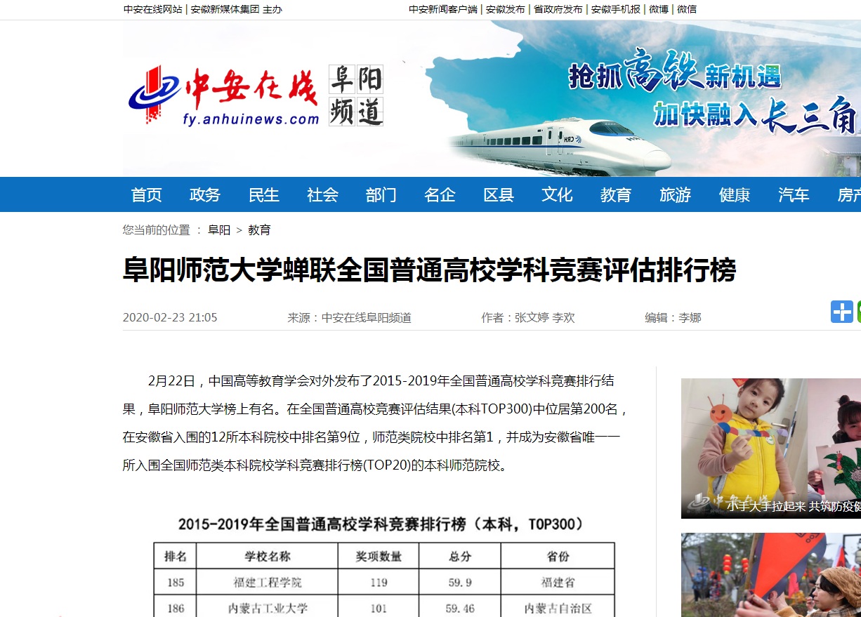 中安在线报道:阜阳师范大学蝉联全国普通高校学科竞赛评估排行榜