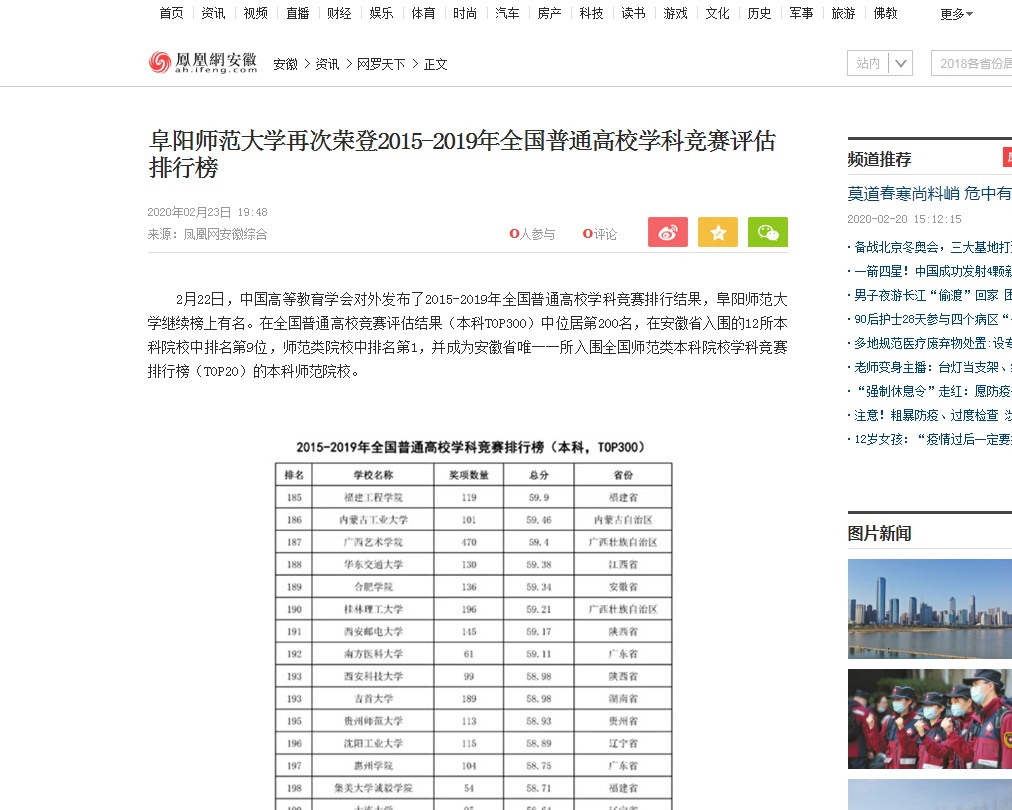 2月23日,凤凰网安徽频道报道:阜阳师范大学再次荣登2015-2019年全国普通高校学科竞赛评估排行榜。文章地址:http://ah.ifeng.com/a/20200223/8073135_0.shtml