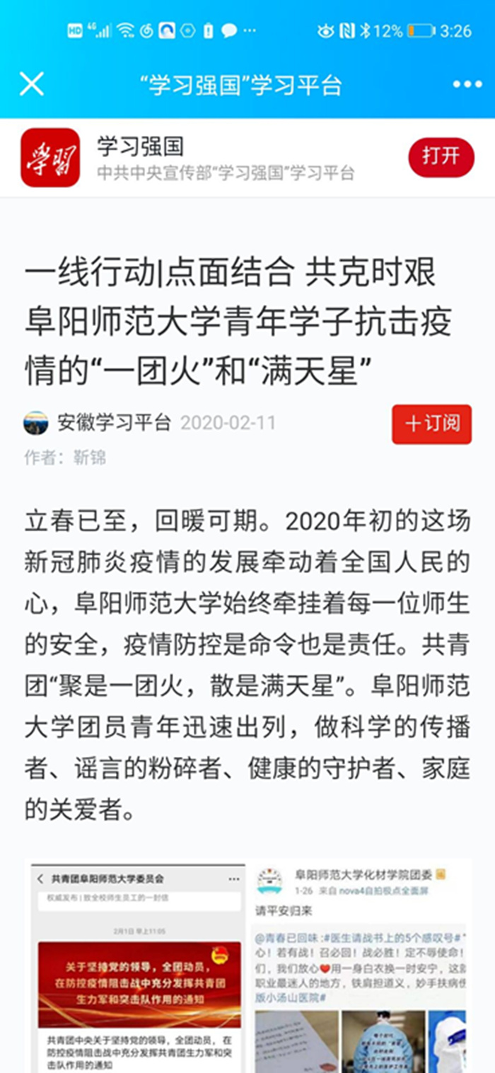 2月11日,“学习强国”学习平台报道:点面结合 共克时艰 阜阳师范大学青年学子抗击疫情的“一团火”和“满天星”。文章地址:https://article.xuexi.cn/articles/index.html?art_id=12698132154592805630&item_id=12698132154592805630&study_style_id=feeds_default&pid=&ptype=-1&source=share&share_to=wx_single&from=groupmessage