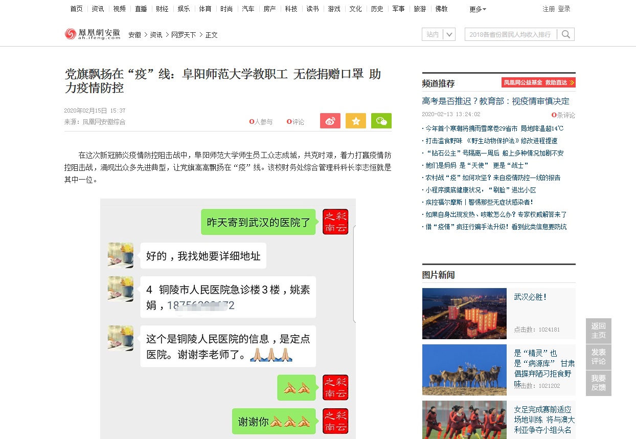 2月15日,凤凰网报道:党旗飘扬在“疫”线:阜阳师范大学教职工无偿捐赠口罩 助力疫情防控。文章地址:
