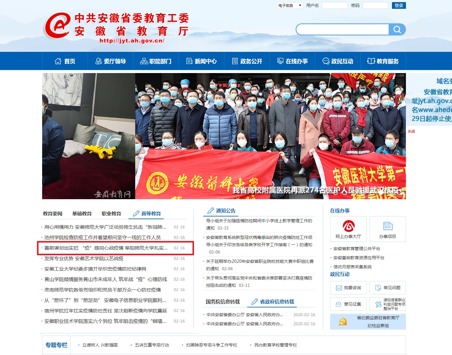 2月15日,安徽教育网首页报道:靠前谋划出实招 “疫”路同心战疫情 阜阳师范大学扎实做好疫情防控期间招生就业工作。文章地址:http://jyt.ah.gov.cn/28/view/672118.shtml
