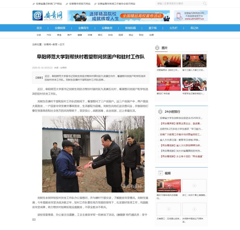 1月16日,安青网报道:阜阳师范大学到帮扶村看望慰问贫困户和驻村工作队。文章地址: