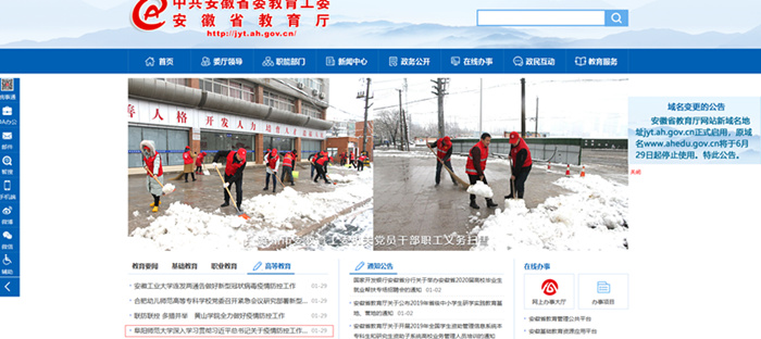 1月29日,安徽教育网首页报道阜阳师范大学深入学习贯彻习近平总书记关于疫情防控工作的重要指示精神。文章地址: