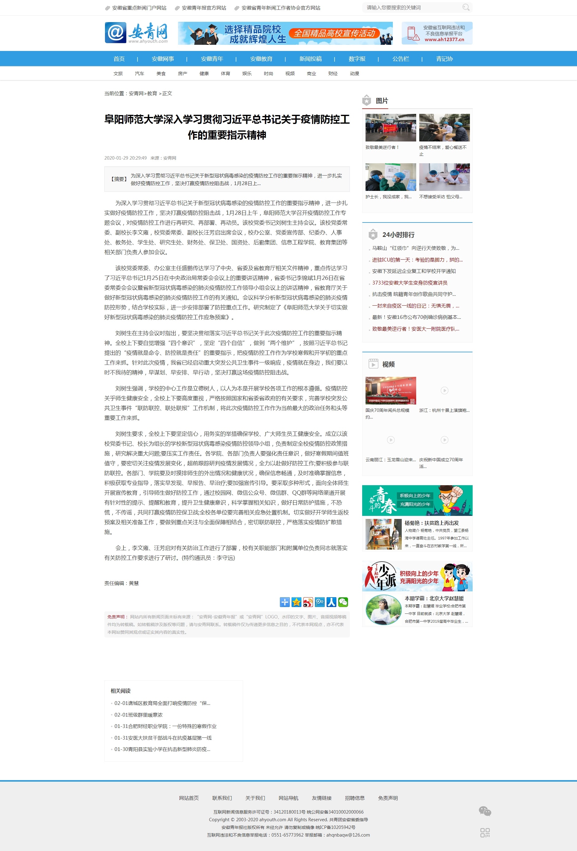 1月29日,安青网报道:阜阳师范大学深入学习贯彻习近平总书记关于疫情防控工作的重要指示精神。文章地址:http://www.ahyouth.com/news/20200129/1423804.shtml?tdsourcetag=s_pctim_aiomsg