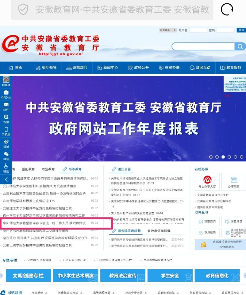 【疫情防控】安徽教育网首页报道:阜阳师范大学看望慰问春节值班一线工作人员 嘱咐做好疫情防控