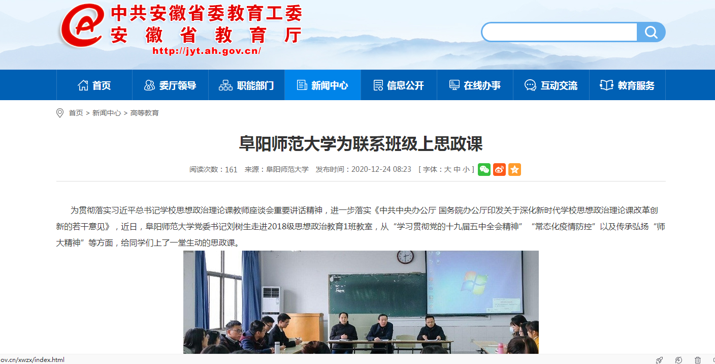 12月24日,安徽教育网首页报道:阜阳师范大学为联系班级上思政课。文章地址: