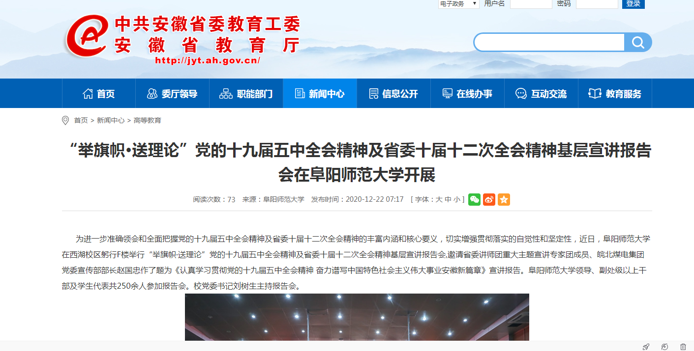 12月22日,安徽教育网首页报道:“举旗帜·送理论”党的十九届五中全会精神及省委十届十二次全会精神基层宣讲报告会在阜阳师范大学开展。文章地址:http://jyt.ah.gov.cn/xwzx/gdjy/40388589.html
