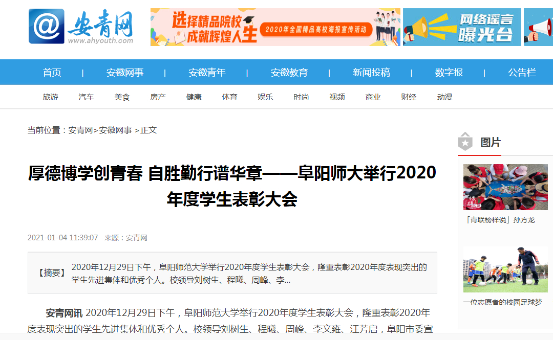 2021年1月4日,安青网报道:厚德博学创青春 自胜勤行谱华章——阜阳师大举行2020年度学生表彰大会。文章地址:http://www.ahyouth.com/news/20210104/1509234.shtml