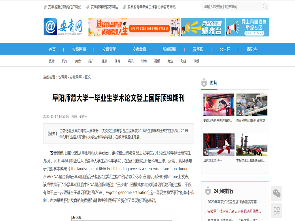 11月17日,安青网报道:阜阳师范大学一毕业生学术论文登上国际顶级期刊。文章地址: