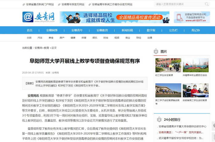 4月20日,安青网报道:阜阳师范大学开展线上教学专项督查确保规范有序。文章地址: