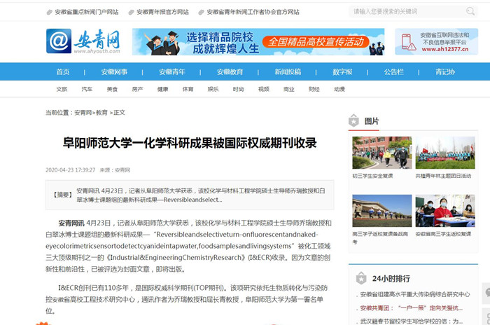4月23日,安青网报道:阜阳师范大学一化学科研成果被国际权威期刊收录。文章地址: