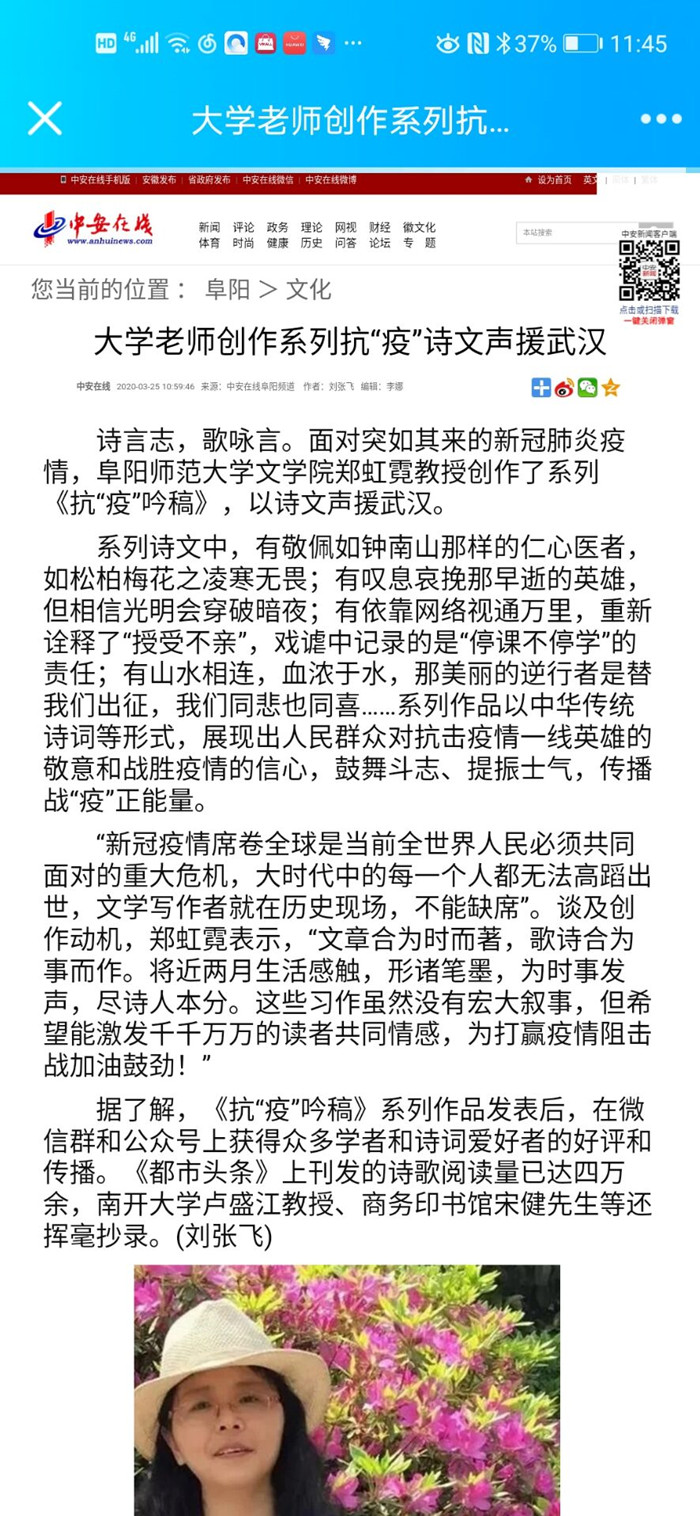 3月25日,中安在线报道:大学老师创作系列抗“疫”诗文声援武汉。文章地址: