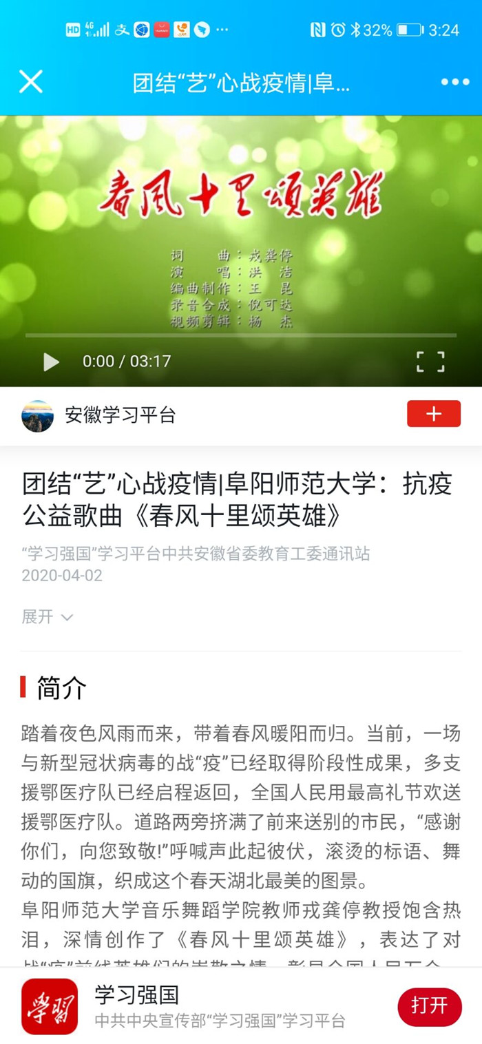 4月2日,“学习强国”学习平台报道:团结“艺”心战疫情|阜阳师范大学:抗疫公益歌曲《春风十里颂英雄》。文章来源:https://article.xuexi.cn/articles/index.html?part_id=13618963660761803363&art_id=13618963660761803363&item_id=13618963660761803363&study_style_id=vide