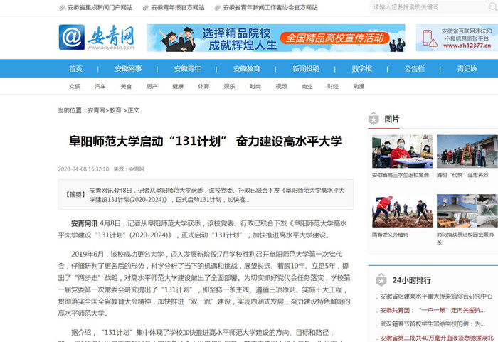 4月8日,安青网报道:阜阳师范大学启动“131计划” 奋力建设高水平大学。文章地址: