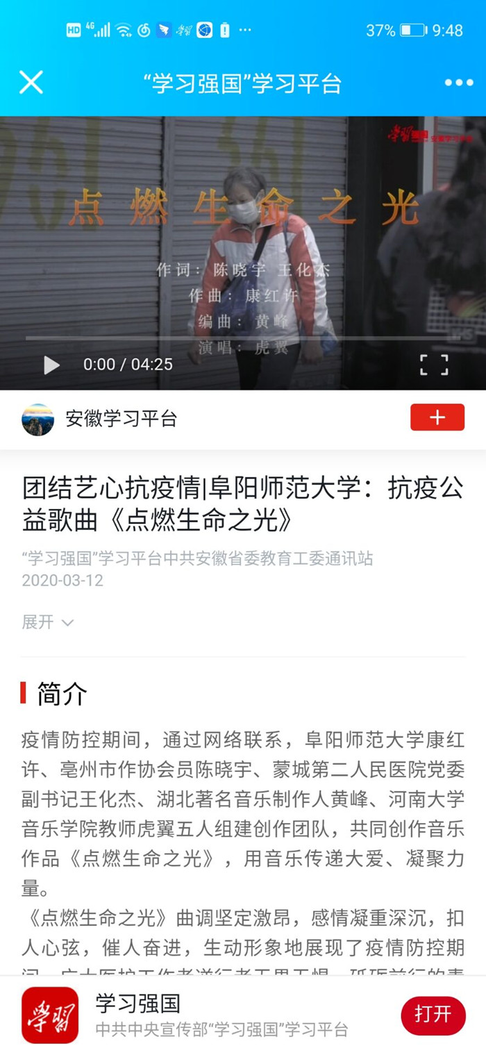 3月12日,“学习强国”学习平台报道:团结艺心抗疫情|阜阳师范大学:抗疫公益歌曲《点燃生命之光》。文章地址:https://article.xuexi.cn/articles/index.html?part_id=9301355991327968312&art_id=9301355991327968312&item_id=9301355991327968312&study_style_id=video_d