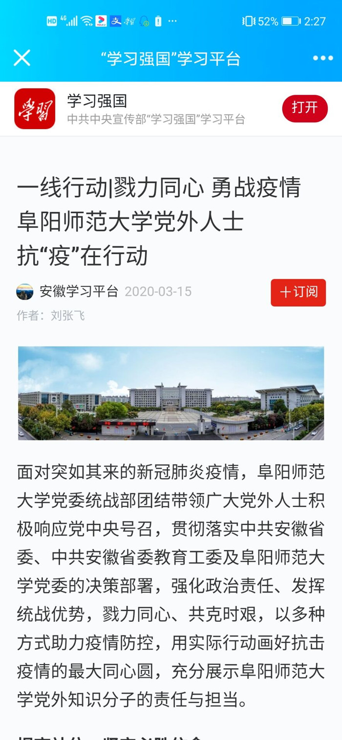 3月15日,“学习强国”学习平台报道:一线行动|戮力同心 勇战疫情 阜阳师范大学党外人士抗“疫”在行动。文章地址:https://article.xuexi.cn/articles/index.html?part_id=8569909934576269706&art_id=8569909934576269706&item_id=8569909934576269706&study_style_id=feeds_d