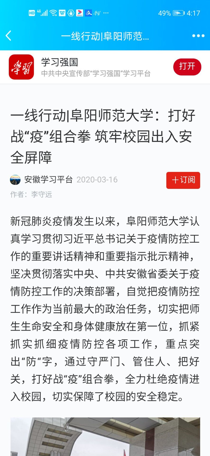 3月16日,“学习强国”学习平台报道:一线行动|阜阳师范大学:打好战“疫”组合拳 筑牢校园出入安全屏障。文章地址:https://article.xuexi.cn/articles/index.html?part_id=8138625910262470977&art_id=8138625910262470977&item_id=8138625910262470977&study_style_id=feeds_d