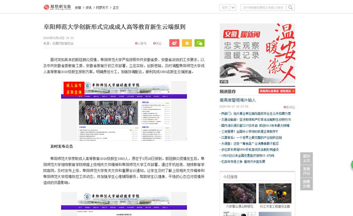 【疫情防控】凤凰网报道:阜阳师范大学创新形式完成成人高等教育新生云端报到