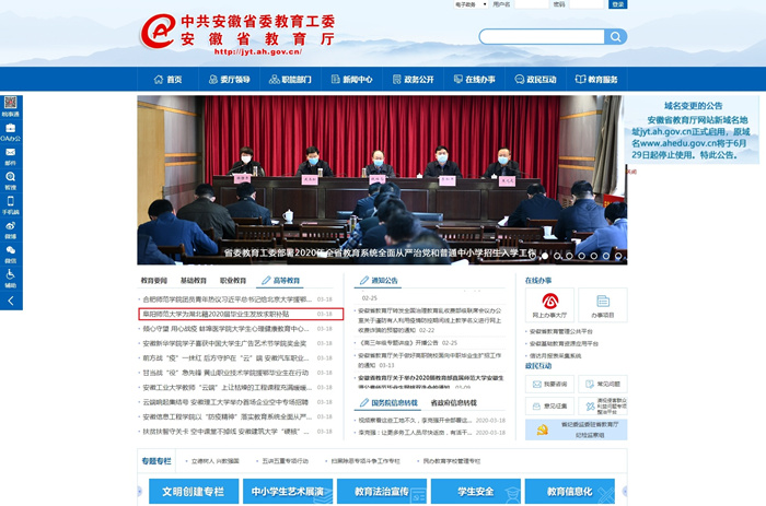 【疫情防控】安徽教育网首页报道:阜阳师范大学为湖北籍2020届毕业生发放求职补贴