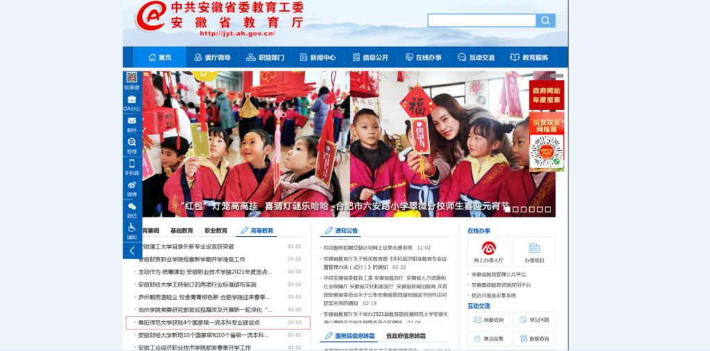 3月3日,安徽教育网首页报道:阜阳师范大学获批4个国家级一流本科专业建设点。文章地址: