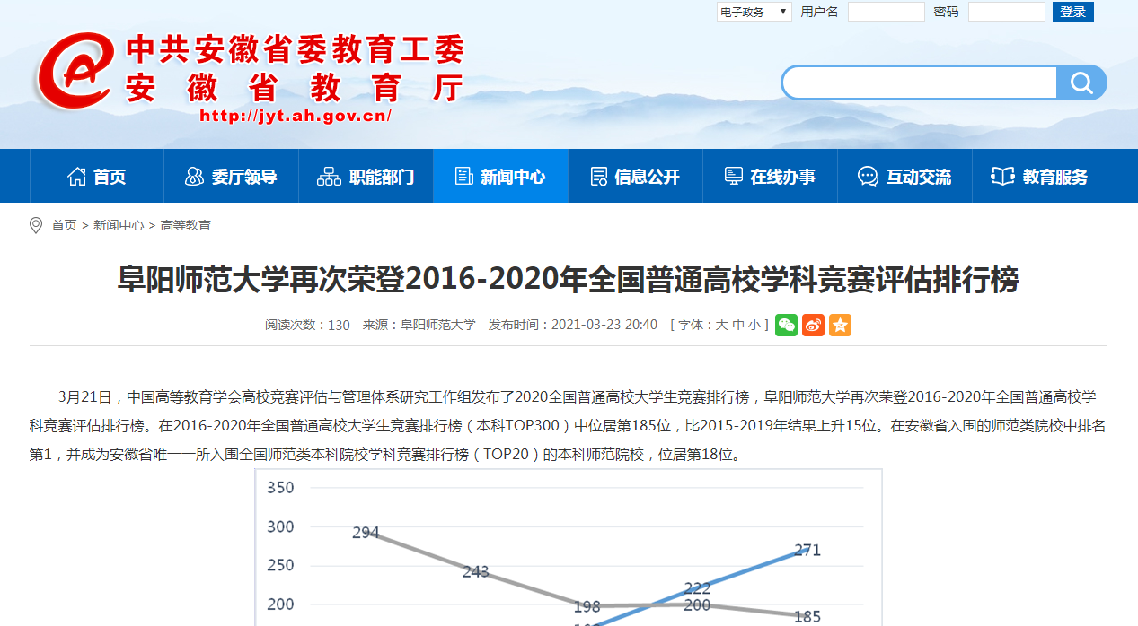 3月23日,安徽教育网首页报道:阜阳师范大学再次荣登2016-2020年全国普通高校学科竞赛评估排行榜。文章地址:http://jyt.ah.gov.cn/xwzx/gdjy/40414972.html