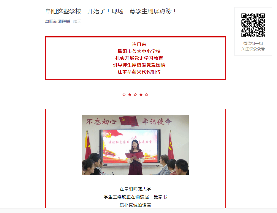 4月8日,阜阳新闻联播微信客户端报道:阜阳师范大学扎实开展党史学习教育 引导师生厚植爱党爱国情 让革命薪火代代相传。文章地址:https://mp.weixin.qq.com/s?__biz=Mzg4NzEyODA1OQ==&mid=2247578281&idx=3&sn=954d3cf8b844d0731687da5987cb1803&chksm=cf8cd83df8fb512bb4e052583f53d9d49ee8179d1be85067c6415a04a60ea442961fe56ab57b&mpshare=1&scene=23&srcid=0408obT3UdDlEXs2nirxjqmw&sharer_sharetime=1617951231731&sharer_shareid=b8542902f3f2de5e6064d9a4ef374629#rd