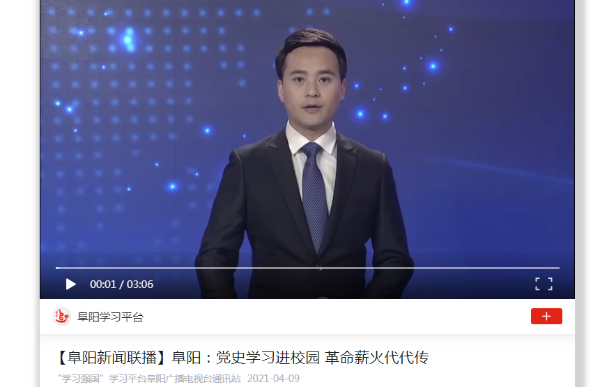 4月9日,“学习强国”学习平台阜阳广播电视台报道:阜阳师范大学扎实开展党史学习教育,引导学生厚植爱党爱国情怀,让革命星火代代相传。文章地址:https://article.xuexi.cn/articles/index.html?art_id=15092589910388648971&item_id=15092589910388648971&study_style_id=video_default&pid=&ptype=-1&source=share&share_to=wx_feed