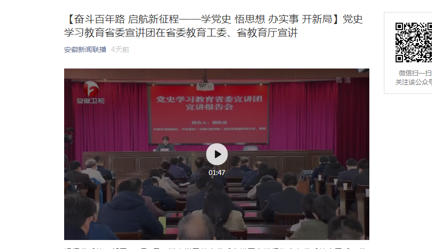 4月11日,安徽新闻联播报道:阜阳师范大学参加党史学习教育省委宣讲团宣讲报告视频会。文章地址:https://mp.weixin.qq.com/s?__biz=MjM5MjIyMjY2OQ==&mid=2650533577&idx=4&sn=597311f3a1595c5a5aa79f7f8812055d&chksm=bea6d26b89d15b7dd5379ff1b9334a51524e4e36b64bfaca25d2885a7334e2caaefbbdf0fcf2&mpshare=1&scene=23&srcid=0411HyFAxdTI4C7olzaTrjzQ&sharer_sharetime=1618458750132&sharer_shareid=b8542902f3f2de5e6064d9a4ef374629#rd