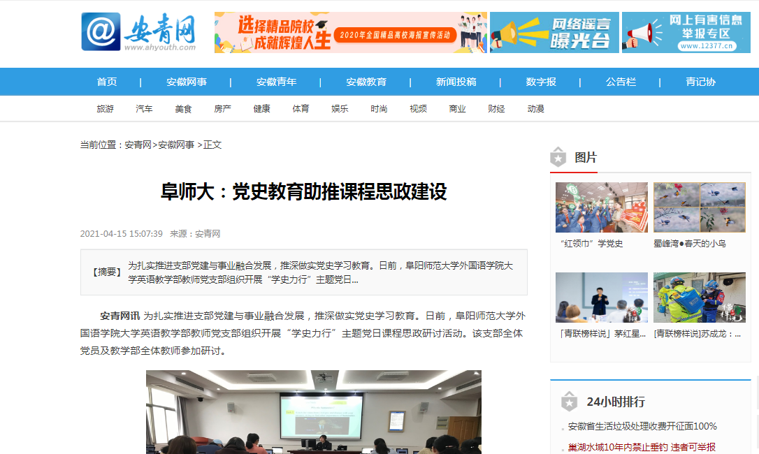 4月15日,安青网报道阜师大:党史教育助推课程思政建设。文章地址: