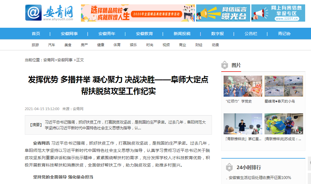 4月15日,安青网报道:发挥优势 多措并举 凝心聚力 决战决胜——阜师大定点帮扶脱贫攻坚工作纪实。文章地址:http://www.ahyouth.com/news/20210415/1529176.shtml