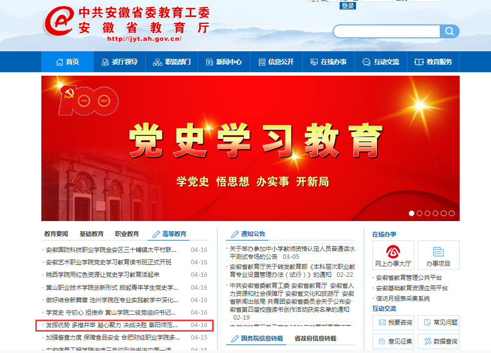 4月16日,安徽教育网首页报道:发挥优势 多措并举 凝心聚力 决战决胜 阜阳师范大学定点帮扶脱贫攻坚工作纪实。文章地址:http://jyt.ah.gov.cn/xwzx/gdjy/40421487.html