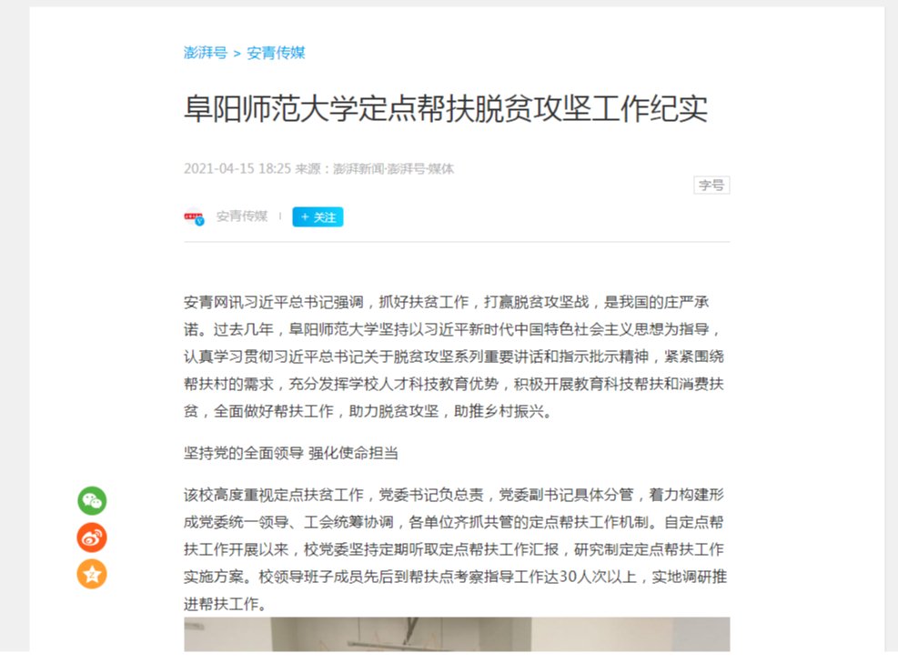4月15日,安青传媒报道:阜阳师范大学定点帮扶脱贫攻坚工作纪实。文章地址: