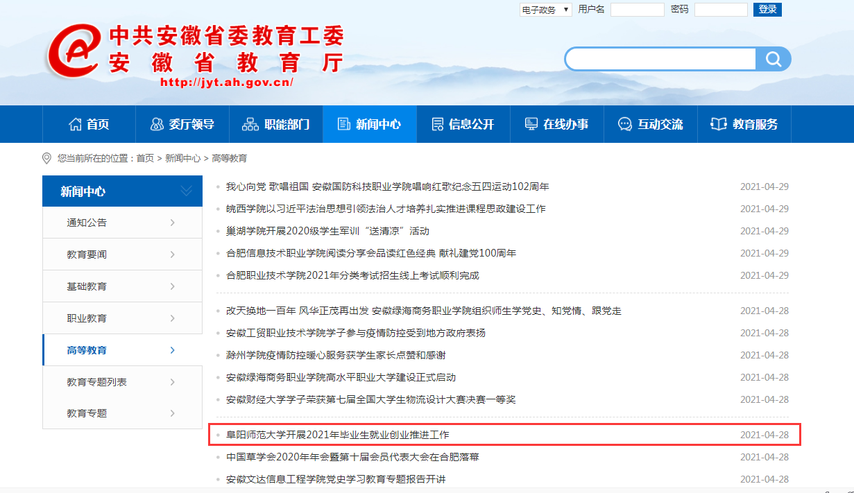 4月27日,安徽教育网首页报道:阜阳师范大学开展2021年毕业生就业创业推进工作。文章地址: