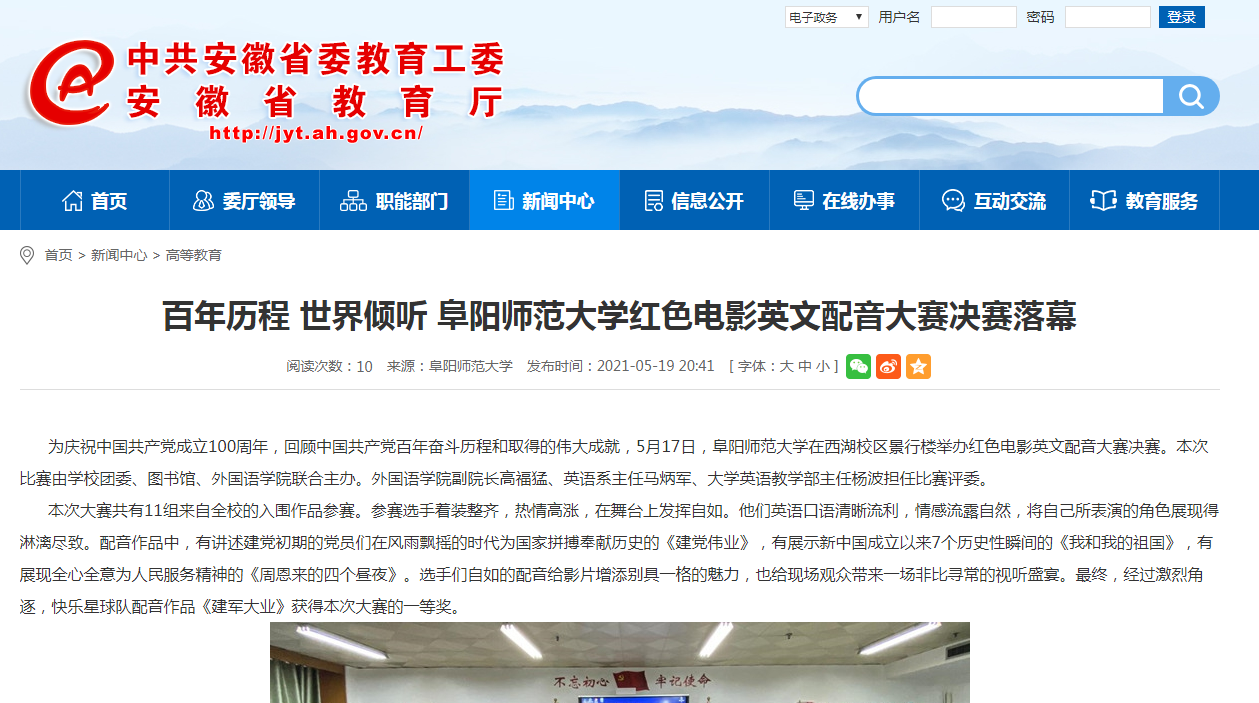 安徽教育网首页报道:百年历程 世界倾听 阜阳师范大学红色电影英文配音大赛决赛落幕