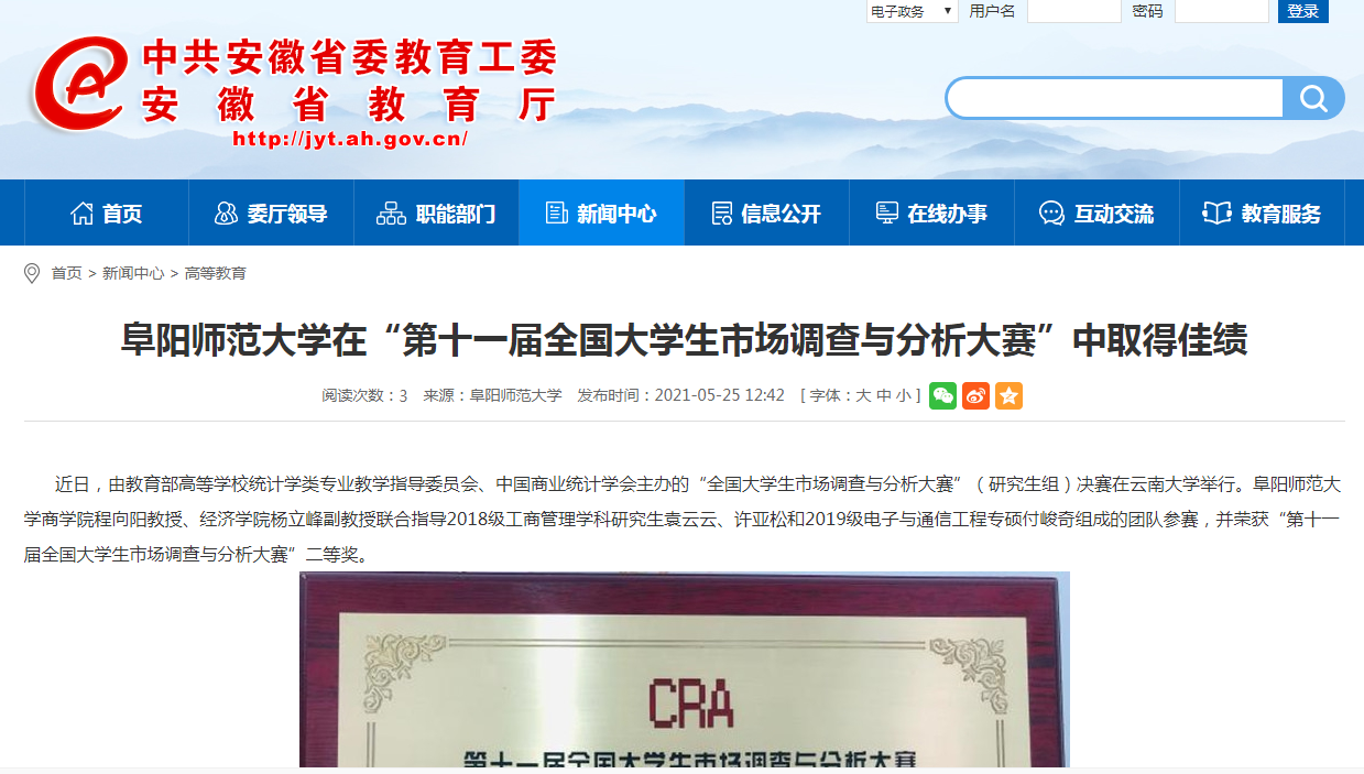 安徽教育网报道:阜阳师范大学在“第十一届全国大学生市场调查与分析大赛”中取得佳绩