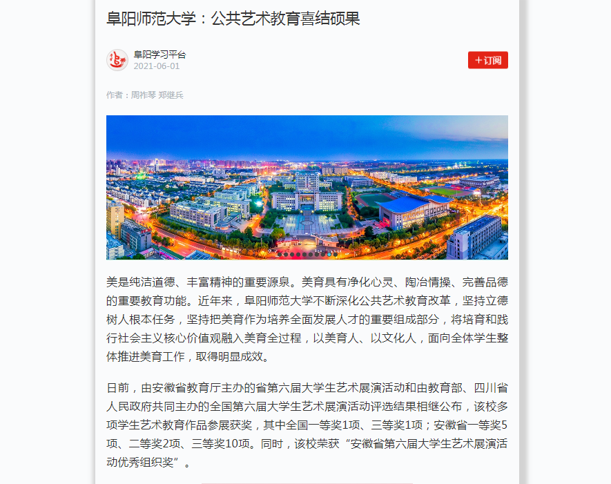 6月1日,学习强国阜阳学习平台报道:阜阳师范大学:公共艺术教育喜结硕果。文章地址:https://article.xuexi.cn/articles/index.html?art_id=17135461489184791643&item_id=17135461489184791643&reedit_timestamp=1622531713000&study_style_id=feeds_default&t=1622538493586&showmenu=false&ref_read_id=8ae4878f-3ca1-4fe9-9440-4d13a75b9747_1622611999925&pid=&ptype=-1&source=share&share_to=wx_single