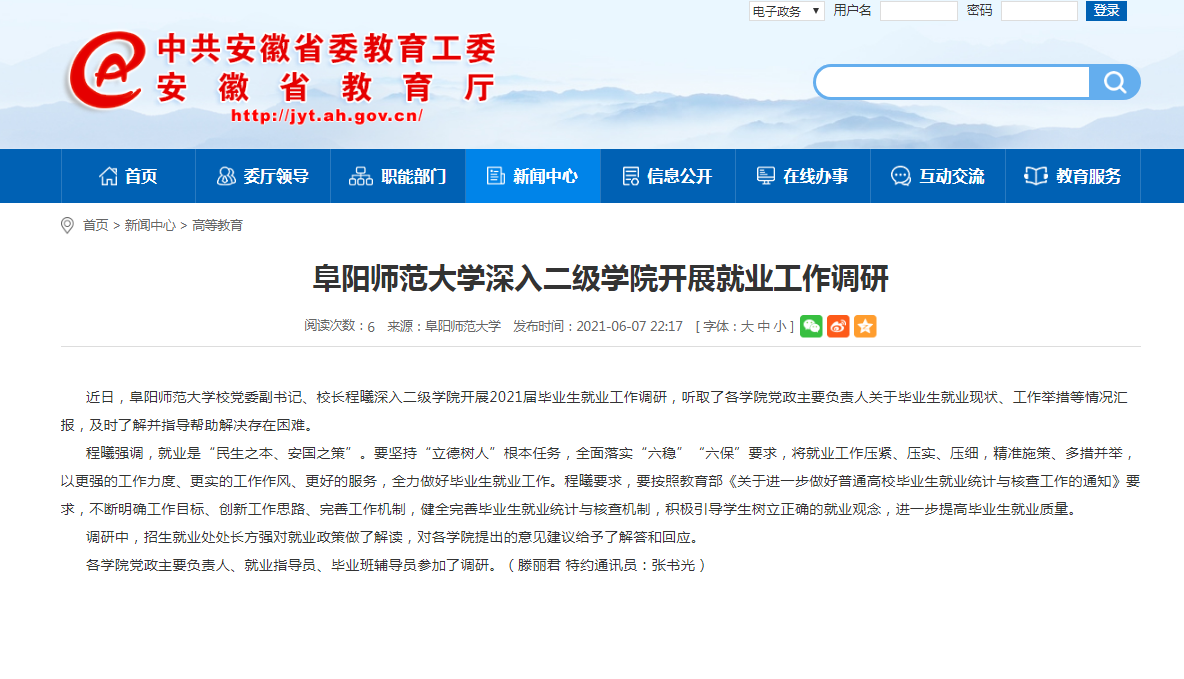 安徽教育网首页报道:阜阳师范大学深入二级学院开展就业工作调研